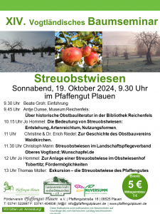 unser XIV. Vogtländisches Baumseminar, am 19.10.2024, 9.30 Uhr ist in diesem Jahr den Streuobstwiesen gewidmet. Wir haben ein abwechslungsreiches Programm zusammengestellt, das historische Aspekte genauso beleuchtet wie die aktuellen Fördermöglichkeiten. Außerdem werden verschiedene Streuobstwiesen der Region vorgestellt. Seien Sie gespannt.