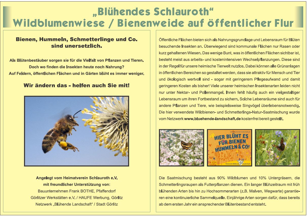 Nach der Einholung einer Erlaubnis zur Umgestaltung der öffentlichen Grünfläche bei der Stadtverwaltung Görlitz, der Einwerbung von Spendengelder wurde durch den Heimatverein und Ortschaftsrat Schlauroth im Mai 2016 mit der Vorbereitung der Arbeiten begonnen. Die Bodenvorbereitung erfolgte nach einer letzten Kurzmahd durch den städtischen Betriebshof mit händischer Verteilung von ca. 45 Tonnen Sand / Kies zur Abmagerung des Bodensdurch fleißige Vereinsmitglieder. Anschließend übernahm eine Fachfirma das Einfräsen des Sandes in den Boden worauf im Anschluss das speziell auf die geologischen Bedingungen nach PLZ zusammengestellte Saatgut “Schmetterlings- und Wildbienensaum” der Fachfirma “Rieger Hofmann GmbH” ausgebracht wurde.